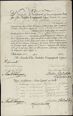Die Gesellschaft wurde bereits 1626 gegründet. 1731 bildete sich unter der Führung von Colin Campbell und Niclas Sahlgren eine neue Gesellschaft, der das ausschließliche Privileg des schwedischen Indienhandels verliehen wurde. Das Hauptgeschäft bestand im Import von Tee aus dem Kaiserreich China. In den ersten Jahren waren die Fahrten sehr profitabel; gegen Ende des 18. Jahrhunderts jedoch nicht mehr. Insgesamt erfolgten 132 Fahrten mit 37 verschiedenen Schiffen. Am 29. Mai 1813 wurde die Gesellschaft schließlich aufgelöst.