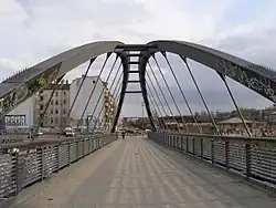 Neun Felder des Brückenzuges stehen auf Stützen, die als leichte Stahlpendelrahmen mit Elastomerlagern an Kopf- und Fußpunkten ausgeführt sind. Zwischen den einzelnen Bauwerkselementen sind wasserdichte Fahrbahnübergänge eingebaut. Die Fahrbahn mit einer Nutzbreite von 5,50 m ist eine orthotrope Platte, die seitlichen Handläufe sind bei Dunkelheit beleuchtet. Das gesamte Bauwerk ist elektrisch gegen die Fahrdrähte der Eisenbahn gesichert und zusätzlich geerdet.[2]