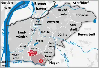 - ↑ Übersichtskarte Landkreis Cuxhaven. In: cuxland-gis.landkreis-cuxhaven.de. November 2016, archiviert vom (nicht mehr online verfügbar) am 11. Dezember 2019; abgerufen am 7. Juli 2020. Info: Der Archivlink wurde automatisch eingesetzt und noch nicht geprüft. Bitte prüfe Original- und Archivlink gemäß Anleitung und entferne dann diesen Hinweis.
