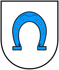 Blasonierung: „In Silber ein blaues Hufeisen mit abwärtsgekehrten Stollen.“[16] |