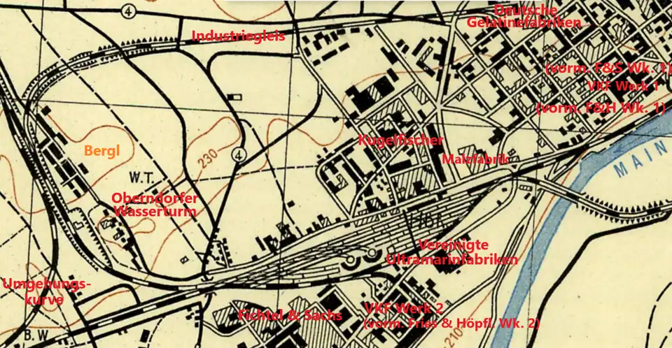 Vereinigte Ultramarinfabriken an heutiger Ernst-Sachs-Straße. Hinten rechts der erste Ringlokschuppen von 1874, links der Main und hinten, rechts der Schornsteine, der alte Ortskern von Oberndorf.