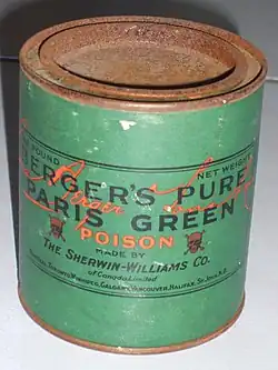 In den USA ließ sich 1868 ein J. P. Wilson die Mischung von einem Teil Paris Green mit zwei Teilen Mineralöl für die Anwendung gegen den Kartoffelkäfer patentieren. Schweinfurter Grün wurde auch in anderen Insektizid-Rezepturen, beispielsweise vermischt mit Holzasche, verwendet. Es war das erste chemische Insektizid, das in großem Umfang angewendet wurde.[18] Mitte der 1890er Jahre wurden in den USA bereits 2.000 Tonnen jährlich verkauft. Um diese Zeit versuchte man dort, Schweinfurter Grün gegen den Schwammspinner einzusetzen, wofür es jedoch ungeeignet war. Bei der Suche nach einem geeigneten Insektizid stellte sich Bleiarsenat als wirksamer heraus. Da es weniger Verbrennungsschäden auf den Blättern hinterließ und dort länger haften blieb, setzte sich Bleiarsenat in den USA als meistverwendetes Insektizid durch.[19]