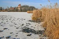 Im Osten des Gebiets, im Bruchwald, ist der Schilfgürtel relativ schmal oder lückenhaft, im südlichen Teil ist das Schilf vollständig auf der Fläche vorhanden. Das Röhricht erreicht eine Breite von über 500 m in Ost-West-Ausdehnung. Der Lebensraum Schilfröhricht wirkt eher einförmig, zeichnet sich aber durch hohe Produktivität aus. Schilfrohr kann bis zu 5 m hoch werden, junge Triebe wachsen täglich 2–4 cm. Schilfröhricht schützt das Ufer gegen viele Einflüsse von außerhalb und ist Lebensraum für zahlreiche Tiere. Taucher, Enten, Rallen, Rohrweihe, Teichrohrsänger und Drosselrohrsänger sowie der seltene Rohrschwirl brüten hier. Viele weitere Vogelarten nutzen das Röhricht als Nahrungs- und Rastplatz, auf dem Durchzug finden sich oft große Schlafgesellschaften von Schwalben, Staren und Stelzen ein. Viele Insekten und andere Kleintiere haben sich auf das Schilfrohr spezialisiert, Amphibien nutzen das Röhricht als Laichplatz.