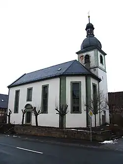 Richard ließ eine erste (Eigen-)Kirche (Capella) errichten, die vor 1104 als selbständige Pfarrkirche geweiht wurde. Der Bau wurde ab 1447 von der dann regierenden Familie Fuchs durch die heutige große Kirche ersetzt, die 1585 bis 1589 erweitert wurde und einen Turm erhielt. 1734 wurde sie erneut umgebaut.