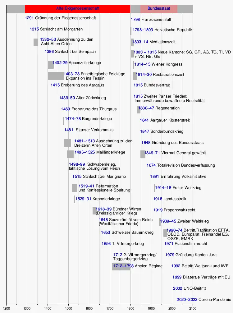 | Unabhängigkeit | 1499 faktische Ablösung vom Heiligen Römischen Reich im Frieden zu Basel, 1648 juristische Trennung vom Heiligen Römischen Reich im Westfälischen Frieden, 1798–1813 französischer Vasallenstaat zur Zeit von Helvetik und Mediation | ||||