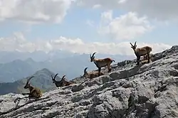 Bei den Huftieren sind ebenfalls verschiedene Arten aus der Schweiz verschwunden, so zum Beispiel der Wisent und der Elch. Einige ausgerottete Arten wie der Alpensteinbock[74] wurden mittlerweile wieder angesiedelt; er bevölkert das Hochgebirge der Alpen. Im Unterwallis gibt es zwei Kolonien von Europäischen Mufflons, die aus Frankreich eingewandert sind. Die Gämse ist in den höher gelegenen Regionen der Alpen sowie des Juras sehr häufig. Grösste Hirschart ist momentan der Rothirsch, der um die Jahrhundertwende vom 19. zum 20. Jahrhundert wieder einwanderte.[62] Kleinste einheimische Hirschart ist das Reh, welches in den 1920er Jahren durch Hegemassnahmen stark gefördert wurde und schon vor 1940 wichtigstes Schalenwild war.[62] Das Reh ist auch die häufigste Hirschart und besiedelt Mittelland und Jura. Im zürcherisch-schaffhausischen Grenzgebiet beim Rafzerfeld kommt der Sikahirsch vor. In den Wirren des Zweiten Weltkrieges entkamen einige Tiere aus süddeutschen Gehegen und besiedelten von dort aus die Schweiz. Ebenfalls recht häufig in einigen Gebieten der Nordschweiz ist das Wildschwein. Von den Nagetieren wurde der Biber (1956) wieder eingeführt. Im September 2023 wurde im Naturpark Thal im Kanton Solothurn eine Testherde von Wisenten in betreuter Halbfreiheit ausgesetzt.