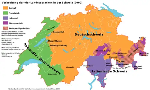- ↑ Regula Schmidlin und Rita Franceschini: Komplexe Überdachung I: Schweiz. In: Joachim Herrgen und Jürgen Erich Schmidt (Hrsg.): Sprache und Raum – Ein internationales Handbuch der Sprachvariation. Band 4: Deutsch. De Gruyter, Berlin/Boston 2019, ISBN 978-3-11-018003-9, S. 1015.