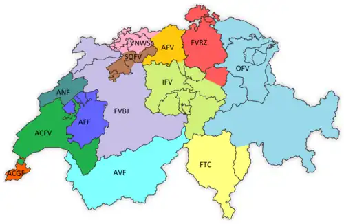 Der SFV gliedert sich in 13 Regionalverbände. Die Mannschaften des Fürstentums Liechtenstein spielen im Ostschweizer Fussballverband. Der einzige deutsche Klub im Schweizerischen Fussballverband, der FC Büsingen, spielt im Fussballverband Region Zürich.