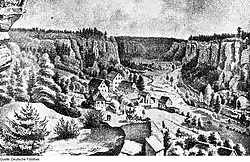 Ab 1837 baute Johann Gottlob Geißler zusätzlich zu seiner bisherigen Mühle mit Gasthof eine Kaltwasserheilanstalt auf. Er profitierte dabei von den in der Umgebung vorhandenen Quellen, die zusätzlich zur Biela die Versorgung mit stark kohlensäurehaltigem Frischwasser sicherten. Bestanden die Bademöglichkeiten anfangs nur aus einigen Wannen- und Kastenbädern an der Biela sowie Duschen und Sturzbädern am Mühlenzulauf, so wurde 1838 bereits das sogenannte Alte Kurhaus, später als Gasthaus Schweizermühle bezeichnet, erbaut. 1866 folgte das Neue Kurhaus im Schweizerstil. Neben den Kuranlagen entstanden im Tal auch diverse Landhäuser und Villen, jeweils umgeben von Gärten. 1886 brannten die bereits nicht mehr betriebene Mühle und das Badehaus ab. Während das Badehaus mit Wellenbad, Schwimmbassin, Wannenbädern, Brausen und einer Arztwohnung wieder aufgebaut wurde, brachen die Betreiber die Reste der Mühle schließlich ab.[2] Bereits 1894 erhielt die Schweizermühle durch eine an der Biela installierte Turbine elektrische Stromversorgung. 1897 richtete ein Hochwasser der Biela schwere Schäden an, wie auch weitere Hochwasser immer wieder Verwüstungen hinterließen, so etwa 1957.[4]