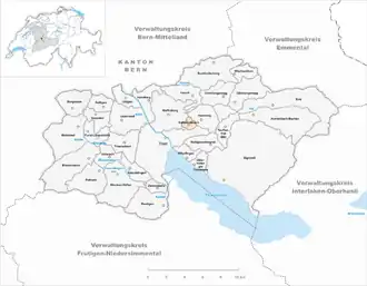 Der Ort liegt an einem nordwärts abfallenden Hang südlich der Zulg im unteren Zulgtal. Er befindet sich gleich östlich der Stadt Thun und ist die flächenmässig kleinste Gemeinde des ganzen Verwaltungskreises. Es gibt kein Dorfzentrum. Vom gesamten Areal der Ortschaft von 149 ha werden 71,5 % landwirtschaftlich genutzt. Weitere 17,9 % – vor allem an der südlichen Gemeindegrenze – sind von Wald und Gehölz bedeckt und 10,6 % Siedlungsfläche.