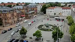 Auf dem Bahnhofsvorplatz befindet sich der Zierbrunnen Rettung aus Seenot aus dem Jahr 1910 mit Bronzeplastiken von Hugo Berwald. Der Brunnen stand bis 1927 ursprünglich auf dem Schweriner Markt.