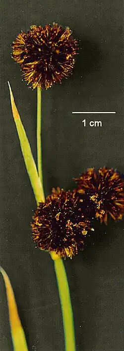 Der Blütenstand wird nicht von einem Tragblatt überragt, ist also endständig; er besteht in der Regel aus einem bis sechs rundlichen, sehr kurz gestielten Knäueln, die einen Durchmesser um 10 Millimeter haben und jeweils bis zu 70 Blüten enthalten. Die Blüten sind dreizählig. Die sechs häufig rot- bis dunkel-braunen, oder auch grünen Blütenhüllblätter sind bei einer Länge von 3 bis 4 Millimetern lanzettlich mit zugespitztem oberen Ende. Die äußeren und inneren drei Blütenhüllblätter unterscheiden sich manchmal geringfügig in der Länge. Die Schwertblättrige Binse hat je nach Varietät drei oder sechs Staubblätter, wenn die Varietät als Art angesehen wird, nur drei. Es sind drei Narbenäste vorhanden.