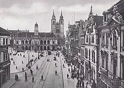 Haus Zum güldenen Hammer auf einer Aufnahme Georg Eduard von Flottwells, Blick vom Alten Markt aus Nordosten, ganz links die Magdeburger Börse, dazwischen die schmale Gasse Schwibbogen, 1889