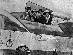 Wien, September 1913: Franz Kafka, Albert Ehrenstein, Otto Pick, Lise Kaznelson. – „Als sie sich alle miteinander zum Scherz photographieren lassen als Insassen eines Aeroplans, der sich über das Riesenrad und über die Spitzen der Votivkirche erhoben hat, ist Dr. K. zu seiner eigenen Verwunderung der einzige, der in dieser Höhe noch eine Art Lächeln zustande bringt.“