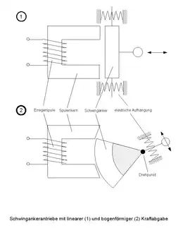 Schwingankerantriebe bestehen aus einem festen Eisenkern mit Erregerspule und einem beweglichen Eisenkern (Anker), der durch Federn in Ruhelage gehalten wird. Wird die Erregerspule von einem Strom durchflossen, so wird der Anker je nach Stromstärke mehr oder weniger aus der Ruhelage gezogen. Durch den ständigen Wechsel der Stromstärke und/oder der Stromrichtung gerät der Anker in eine mechanische Schwingung, die zu Antriebszwecken genutzt werden kann. Der Anker ist oft mit einem Dauermagnet ausgerüstet; dadurch erhöht sich die Effizienz, und die Schwingfrequenz entspricht derjenigen der speisenden Wechselspannung.