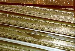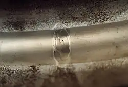 Ermüdungsschaden am Außenring eines Wälzlagers[3]Lokale Verzahnungsschäden (Weniger als alle Zahnflanken besitzen eine Flankenformabweichung, z. B. infolge von Ermüdung.) führen zur Modulation der Zahneingriffsschwingung mit der Drehfrequenz des geschädigten Zahnrades.