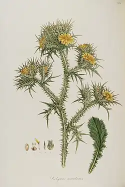 - ↑ Werner Greuter (2006+): Compositae (pro parte majore). – In: W. Greuter & E. von Raab-Straube (Hrsg.): Compositae. Euro+Med Plantbase - the information resource for Euro-Mediterranean plant diversity. Datenblatt Scolymus maculatus In: Euro+Med Plantbase - the information resource for Euro-Mediterranean plant diversity.