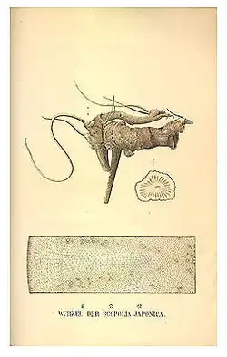 - ↑ Yoshihiro Mano, Shigeyasu Nabeshima, Chiaki Matsui, Hideo Ohkawa: Production of Tropane Alkaloids by Hairy Root Cultures of Scopolia japonica. In: Agric. Biol. Chem. Volume 50(ll), 1986, S. 2715–2722 (PDF).