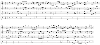 - ↑ In seltenen Einzelfällen kann es durch eine besondere Anordnung der Synkopen zum Phänomen von (scheinbaren) Taktwechseln kommen: Innerhalb der einzelnen Stimmen wechselt der Rhythmus, z. B. zwischen 3/4- und 6/8-Takt (siehe Purcells Hornpipe aus dem 3. Akt von The Fairy Queen in der Abb.). Beim Zuhören kann der Eindruck entstehen, dass einzelne Stimmen holpern und stolpern; die Ordnung scheint sich aufzulösen, aber am Ende finden die Stimmen wieder zusammen. Im Deutschen nennt man solch ein Tanzstück mit wechselndem Rhythmus bildhaft einen Rüpeltanz.
