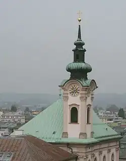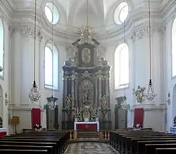 Beeindruckend ist das 1752 geschmiedete Abschlussgitter unter der Musizierempore, in das eiserne Rosen, Ranken, Vasen und Muscheln verwoben sind. Es zählt mit dem Abschlussgitter der Peterskirche zu den Hauptwerken des Künstlers Phillipp Hinterseer.