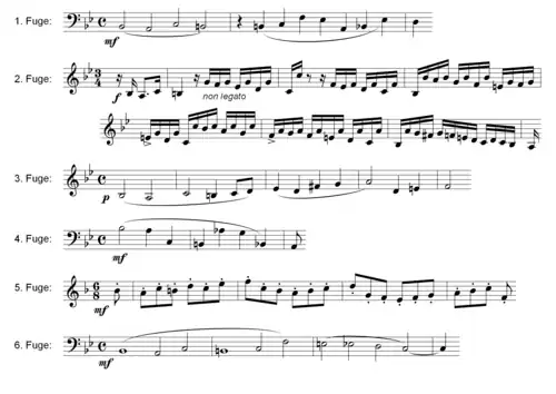 | 1. und 6. Fuge | langsamer Beginn, dann Steigerung bis zum sehr schnellen Tempo | fünf |