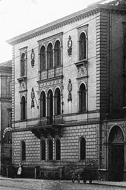 Das Erdgeschoss war mit Rustika verkleidet. Die beiden Obergeschosse hatten eine Frontlänge von fünf Fensterachsen. Die drei mittleren Fenster der beiden Obergeschosse waren (ähnlich wie beim Albert-Theater) zu Drillingsfenstern zusammengefasst. Im ersten Geschoss befand sich ein Balkon mit schmiedeeisernem Gitter. Die Ecken des Hauses wurden von einer Diamant-Eckquaderung zusammengefasst.[3]