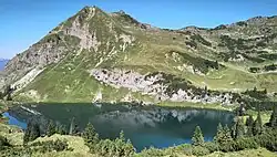 | Seeköpfle (Bergspitze über dem Wasserlauf) von Süden aus dem Gebiet der Lugenalpe. | ||