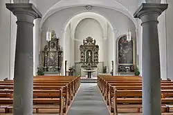 Die Kapelle ist ein einschiffiger Betraum, der durch Pilaster gegliedert ist. Darüber ist Stichkappentonnengewölbe. Der 3/8-Chor ist eingezogen und weist Stichkappengewölbe auf. Die Empore ruht auf zwei Säulen.