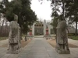 Diese Steinmenschen vor den Gräbern werden auch Wengzhong[3] genannt, was auf folgendem Hintergrund beruht: In der Zeit der Qin-Dynastie soll ein Riese von herkuleischer Gestalt namens Ruan Wengzhong[4] gelebt haben.[5] Er war in Lintao[6] (Gansu) garnisoniert und hatte sich im Kampf gegen die Xiongnu Verdienste erworben. Nach seinem Tod trauerte Qin Shihuang um ihn und befahl, eine bronzene Statue nach ihm anzufertigen und sie außerhalb des Sima-Tores des Xianyang-Palastes (Xianyang gong) aufzustellen. Es heißt, dass die Xiongnu (Hunnen) ihn, als sie nach Xianyang (der Hauptstadt von Qin in Shaanxi) kamen und die Statue sahen, für den lebendigen Ruan Wengzhong hielten und Reißaus nahmen. Seither nennt man die Bronze- oder Steinfiguren vor kaiserlichen Palästen oder Gräbern Wengzhong. Die steinernen Tierskulpturen vor den Gräbern (shixiangsheng) lassen sich auf die des Grabes von Huo Qubing in der Zeit der Han-Dynastie zurückführen. Huo war ein junger berühmter Militärstratege der früheren Han-Zeit. Bereits mit achtzehn Jahren begleitete er den Han-Kaiser Wu (Han Wu di), er war sehr geschickt im Reiten und Schießen. Mit zwanzig Jahren führte er zweimal seine Truppen im Hexi-Korridor (Gansu-Korridor) gegen die Xiongnu (Hunnen) zum Sieg und erwarb sich große Verdienste. Er verstarb bereits im Alter von nur vierundzwanzig Jahren. Han Wudi hat zu Ehren seines geliebten Generals östlich seines eigenen Mausoleums (Maoling) eigens die Hu-Qubing-Grabanlage erbauen lassen. Diese ähnelt in seiner Gestalt dem Qilian-Gebirge (Qilian Shan), um an seine Leistungen im Hexi-Korridor (Gansu-Korridor) zu erinnern. Steinschnitzer haben die Tiere des Qilian-Gebirges zum Vorbild für Huo Qubings Grab genommen, davon ist das „Auf einen Hunnen tretende Pferd“ am bekanntesten, diese Skulptur fasst die großen Verdienste des kurzen Lebens von Huo Qubing zusammen. Diese Reihe enthält die frühesten großen Steinschnitzereien vor chinesischen Gräbern. Später ließen die Kaiser beim Bau des eigenen Grabes ebenfalls diese Dekoration einrichten, deswegen gibt es bei den heute noch vorhandenen Tang-, Song-, Ming- und Qing-Mausoleen fast immer eine Aufreihung in Form einer Ehrengarde[7] vor dem Grab.