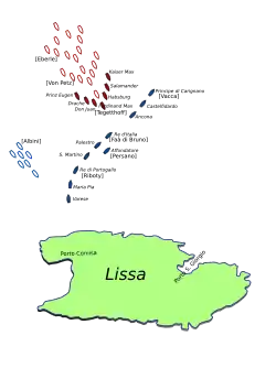 Am Nachmittag des 16. Juli stach Admiral Persano in See. Die Flotte nahm anfangs einen nordöstlichen Kurs, um das Angriffsziel zu verbergen. In der Nacht vom 16. auf den 17. Juli näherte sich der Messaggero unter (falscher) britischer Flagge fahrend mit Stabschef d'Amico an Bord der Küste, um die Positionen der Küstenbatterien und Festungen auszukundschaften.[14] Persanos Plan sah vor, San Georgio mit dem größten Teil seiner Flotte zu bombardieren, die Festungen von Comisa mit einer kleineren Abteilung zu zerstören, damit eine später eintreffende Streitmacht dort landen konnte, und die Expeditionsstreitkräfte, die er bei sich hatte, in Manego anzulanden. Die Kanonenboote wurden nach Lesina auf der Insel Hvar, geschickt, um das Telegraphenkabel nach Lissa zu kappen und alle Boote zu zerstören, die Informationen an das Festland übermitteln könnten. Ein Späher wurde ausgesandt, um zwischen den Inseln Pelagosa und St. Andrea zu kreuzen, ein weiterer nach Punta Planca auf dem Festland. Durch diese Aufteilung setzen sich die Italiener der Gefahr aus, von örtlich überlegenen Einheiten der Österreicher vernichtet zu werden. Darüber hinaus war mit der Erteilung von Befehlen, die vor dem Verlassen der Flotte hätten erteilt werden müssen, soviel Zeit verloren gegangen, dass die Italiener am 18. Juli erst nach 10 Uhr morgens ihre Stellung erreichten. Dank dieser Verzögerung hatten die Österreicher genug Zeit gehabt, um von Tegetthoff die Ankunft der Italiener zu telegrafieren. Um 10:30 Uhr gab Persano den Befehl zum Angriff.[15]