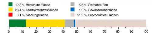 Es besteht zu 12,3 % aus bestockter Fläche, zu 28,4 % aus Landwirtschaftsfläche, zu 0,1 % aus Siedlungsfläche, zu 6,6 % aus Gletscher/Firn, zu 1,0 % aus Gewässerfläche und zu 51,6 % aus unproduktiven Flächen.[2]