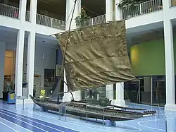 Auslegerboot mit Rahsegel aus Pandanus-Blattstreifengeflecht