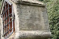 Die Inschrift lautet auf der Vorderseite: „1699, 24 MEI“. An der Seitenwand der Nische befindet sich folgender Text: „o mensch gedenck an got, der fur dich geliten hat, der her fur uber geet und her fur niederknit und her fur trit, fur die abgestorben bit [...] das creux hat die gemein gestelet alein, o mensh, halt dich rein“. Mit „gemein“ soll wohl ausgedrückt werden, dass die Gemeinde den Segenstein aufgestellt hat.