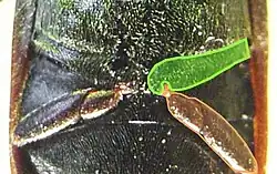 | Bild 6: Prosternalfurche, rechts grün, schematisch | Bild 7: Schenkeldecken, rechts grün unterlegt |