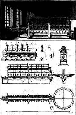 Die Zwirnmühlen wurden durch ein Wasserrad, Göpel, manchmal wohl auch Treträder oder Handkurbeln angetrieben. Ein Filatorium mit 200 bis 240 gleichzeitig laufenden Spindeln bewirkte eine 25- bis 50fache Produktivitätssteigerung gegenüber Handarbeit.
