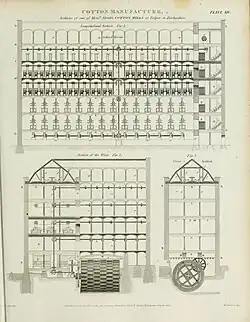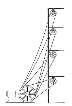 Die meist im Erd- oder Kellergeschoss stehende Dampfmaschine[2] dieser Fabriken trieb über ein kompliziertes System von Wellen, Seilen und Treibriemen die einzelnen Maschinen an: Die zentrale, von der Antriebsmaschine getriebene Königswelle transportierte über Seiltrommeln die Antriebsenergie in einem ersten Schritt über mehrere aus Baumwolle gefertigte Seile an Transmissionswellen zu den einzelnen Stockwerken. Diese Wellen verliefen dann – meist unterhalb der Decke – durch die Produktionsräume; von ihnen wurde der Antrieb über Transmissionsscheiben und lederne Riemen zu den Maschinen geleitet.[1]