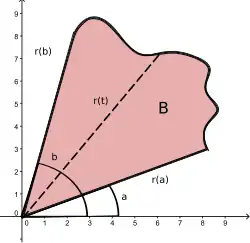 Da diese Formel im Gegensatz zur vorherigen keinen orientierten Flächeninhalt verwendet, ist sie nur für sternförmige Mengen gültig. Ist ein Zentrum der sternförmigen Menge, so lässt sich r(t) mittels der Beziehung aus den Koordinatenfunktionen der Parameterkurve berechnen.