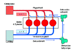 - Bei direkt einspritzenden Ottomotoren ist auch ein Aufheizen des Katalysators durch Nacheinspritzungen möglich, sodass in solchen Systemen meist keine Sekundärluftsysteme verbaut sind.