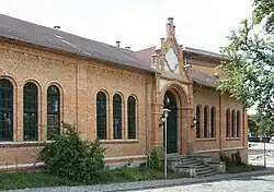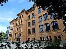 Das 1885 errichtete Schulgebäude erinnert in der Gestaltung an einen italienischen Stadtpalast, der Grundriss orientiert sich an barocken Vorbildern. Die 13-achsige Fassade ist durch zwei dreiachsige Seitenrisalite und einen ebenfalls dreiachsigen Mittelrisalit geprägt und mit Terrakottaverzierungen im Stil des Manierismus verziert. Bemerkenswert ist eine bereits 1882 errichtete Turnhalle. Die als Brauhausturnhalle bekannte Halle entstand im Stil des Historismus.