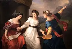 Auf dem querformatigen Gemälde sind drei lebensgroße Frauen in Dreiviertel-Länge (Kniestück) vor einer Landschaft dargestellt. Eine rot gekleidete Frau mit einem violetten Schal sitzt links im Bild. Sie hält ein Notenblatt auf dem Schoß und auf ihrer Gürtelschnalle ist eine Leier abgebildet, wodurch sie als Allegorie der Musik gekennzeichnet ist.[2] Genau in der Mitte steht prominent die Künstlerin selbst. Sie trägt ein weißes Kleid der zeitgenössischen Mode und ist durch keine Attribute ausgezeichnet.[3] Rechts daneben steht eine Frau in einem blauen Kleid und mit einem roten Schal. Sie hält eine Palette und Pinsel in ihrer linken Hand, wodurch sie als Allegorie der Malerei charakterisiert ist. Mit der rechten Hand deutet sie auf einen klassischen Tempel hoch oben auf einem Hügel in der Ferne.[4]