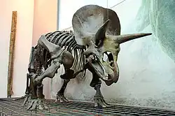 Der Hadrosaurier Parasaurolophus mit dem gebogenen Schädelkamm, Psittacosaurus mit der deutlich herauspräparierten Beborstung im Schwanzbereich sowie dem gut sichtbaren fossilen Mageninhalt und Oviraptor auf den originalen Sauriergelegen gehören zu Europas größter Ausstellung von Großsauriern, zu der auch der Abguss eines „Quetzalcoatlus“ („Quetzi“), des größten bekannten Flugsauriers, zählt. Weitere Publikumsmagnete sind Kopien von Tyrannosaurus rex, Iguanodon und Triceratops aus der Oberkreide von Nordamerika, von dem auch zwei originale Schädel ausgestellt sind (Triceratops horridus aus der Lance-Formation, Wyoming[16]). Das vollständige Exemplar ist das Wappentier des Senckenberg Naturmuseums. Von größter Seltenheit ist die fossile Mumie eines entenschnäbeligen Hadrosauriers.