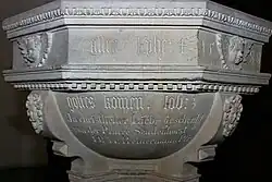 | Beschriftung zwischen den beiden oberen Gesimsen (alle vier Seitenansichten zusammengefasst) | 1588 * Ein herr ein geloũe * ein taũff, ein godt * und vader unser *aller Ephe: 4 * darunter das Wappen mit der Inschrift HIERONIMVS HOGEHERTE |