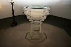 Im Jahr 1870 wurde jedoch für die neue Kirche von einem „örtlichen Gutshof“[8] ein neugotischer Taufbrunnen mit einem durchscheinenden Kristall gestiftet.[9] Diese Stiftung war wahrscheinlich der Anlass, dass Sendenhorst der Gemeinde Westkirchen den alten, hier so bezeichneten Sendenhorster Taufstein schenkte, da man zwei Taufsteine nicht benötigte und einer entbehrlich war.[10] Wie der Inschrift zu entnehmen ist, erfolgte die Schenkung der Pfarre Sendenhorst an die Gemeinde in Westkirchen dann im Jahr 1871 durch einen Pfarrer namens Reinermann. Damit kann nur Pfarrer Johann Reinermann aus Emsdetten gemeint sein, der von 1865 bis 1872 Pfarrer der Gemeinde war.[11] Seitdem befindet sich der Stein in der Laurentiuskirche.[12]