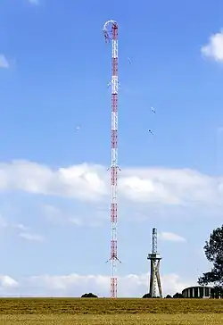 Sendergebäude mit ehemaligem Fernmeldeturm und 280 Meter hohem Gittermast (April 2007)