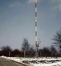Als Antennenträger wurde ein 104 Meter hoher, gegen Erde isolierter Sendemast verwendet. Der Mast hatte ein Gewicht von 36.000 kg. In 46 Meter und 86 Meter Höhe waren Drahtseile (Pardunen) angebracht, die den Mast hielten. Der Technikraum und eine Wohnung für den Sendeleiter befanden sich in einem in der Nähe stehenden Haus.