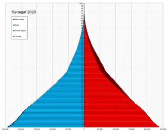 Senegal hatte 2023 17,8 Millionen Einwohner.[13] Das jährliche Bevölkerungswachstum betrug + 2,5 %. Zum Bevölkerungswachstum trug ein Geburtenüberschuss (Geburtenziffer: 32,1 pro 1000 Einwohner[14] vs. Sterbeziffer: 5,5 pro 1000 Einwohner[15]) bei. Die Anzahl der Geburten pro Frau lag 2022 statistisch bei 4,3, die der Region West- und Zentral-Afrika betrug 4,9.[16] Die Lebenserwartung der Einwohner des Senegal ab der Geburt lag 2022 bei 67,9 Jahren[17]. Der Median des Alters der Bevölkerung lag im Jahr 2021 bei 17,8 Jahren.[18] Im Jahr 2023 waren 41,1 Prozent der Bevölkerung unter 15 Jahre,[19] während der Anteil der über 64-Jährigen 3,1 Prozent der Bevölkerung betrug.[20]