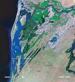 Die Barrierewirkung und die Länge der Küstendünen lässt sich sehr gut anhand eines während einer Hochwassersituation am 4. November 1999 aufgenommenen Satellitenfotos erkennen, das zeigt, wie die ganze Stadt Saint-Louis von Wassermassen eingeschlossen ist. Als im Oktober 2003 ein ähnlich bedrohliches Hochwasser die Stadt gefährdete, veranlassten lokale Behörden am 3. Oktober, etwa 6 Kilometer südlich der Île Saint-Louis und 25 Kilometer vor der Mündung einen 4 Meter breiten Durchstich durch die etwa 300 Meter breite Landzunge zu graben.