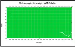 | 12 WM-Spiele 5 Siege 3 Unentschieden 4 Niederlagen 16:17 Tore | |