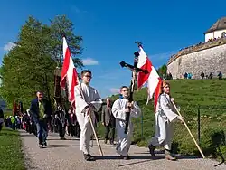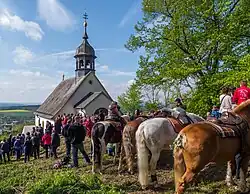 Hinauf zur Kapelle führt ein Kreuzweg mit 14 Stationen. Er wurde im Jahr 1898 angelegt und vermutlich in den 1960er-Jahren mit Betonplatten befestigt. Die Stationen und der Weg wurden 2002 wegen schlechtem Zustand und starker Beschädigung für über 100.000 Euro saniert.[4]