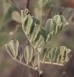 Die wechselständig an den Zweigen angeordneten Laubblätter sind in Blattstiel sowie Blattspreite gegliedert und insgesamt 3 bis 6 cm lang. Der stielrunde Blattstiel ist 6 bis 15 mm lang. Die gefiederte Blattspreite besteht aus drei bis acht Paare Fiederblättchen, die einen Abstand voneinander von 6 bis 10 mm aufweisen. Die grau-grünen oder silbrigen[1] Fiederblättchen sind bei einer Länge von 15 bis 25,[2] selten bis zu 40 mm[1] sowie einem Durchmesser von 0,2 bis 0,3[1] bis etwa 1 mm stielrund[2], schmal-zylindrisch[1], auf der Oberseite gerillt oder etwas eingerollt mit spitzem oder stumpfem oberen Ende. Zwischen den untersten Fiederblattpaaren sind ein bis drei sitzende, flache Drüsen vorhanden. Die früh abfallenden Nebenblätter sind nadelförmig.[2]